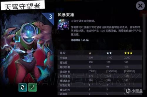复制体可以使用天穹守望者当前所有的物品与法术,且冷却时间单独计算。攻击时产生-50%的魔法值,而受到伤害时不产生魔法值。复制体在有蓝的情况下可以再进行自我复制,利用电狗越复制越多的方法达到血入对方20+血量的目标。